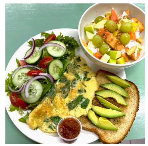 Omelette con jitomate, cebolla y chile serrano, servido con una rebanada de pan integral tostado con aguacate y ensalada.