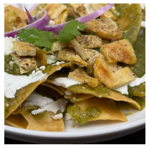 Totopo de maíz, pechuga de pollo, queso fresco, crema, cebolla morada y salsa verde.