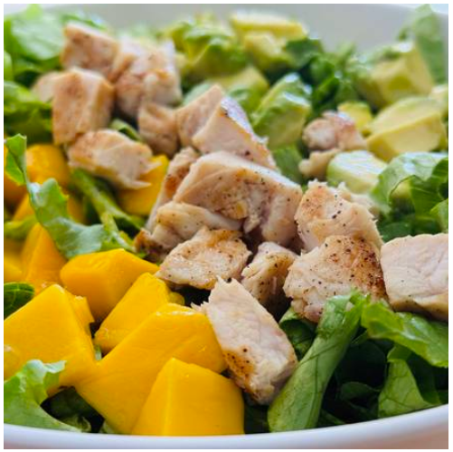 Mix de lechugas, espinaca baby, pepino, aguacate, mango y pechuga de pollo. Mix de lechugas (romana y morada).