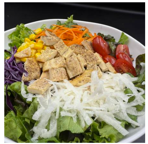 Mix de lechugas, col morada, zanahoria, jitomate cherry, elote y pechuga de pollo. Mix de lechugas (romana y morada).