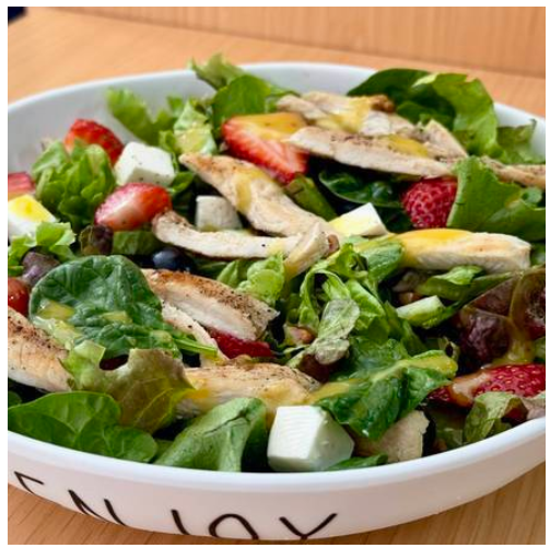 Mix de lechugas, espinaca baby, arándano fresco, fresa, nuez, panela y pechuga de pollo. Mix de lechugas (romana y morada).