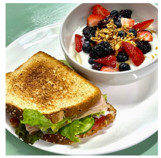 Sándwich de jamón, pollo o atún y un bowl de yogurt con frutos rojos.