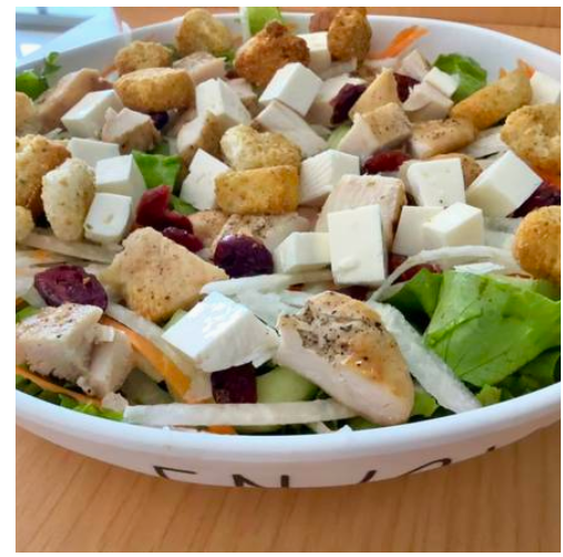 Mix de lechugas, pepino, zanahoria, jícama y arándano deshidratado, panela y pechuga de pollo. Mix de lechugas (romana y morada).