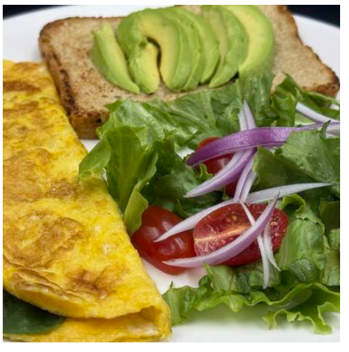 Omelette de queso panela, servido con una rebanada de pan integral tostado con aguacate y ensalada.