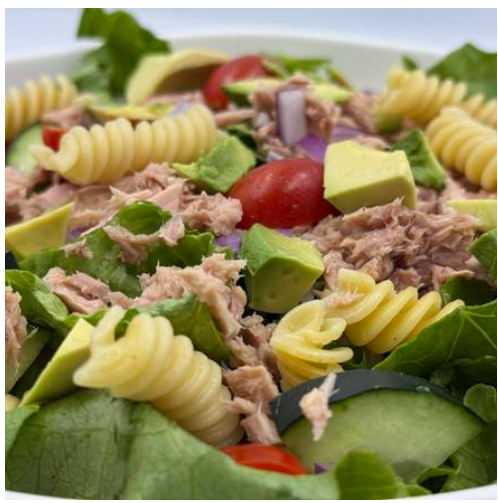 Mix de lechugas, pepino, cebolla morada, jitomate cherry, aguacate, pasta y atún. Mix de lechugas (romana y morada).