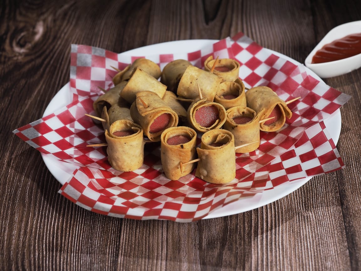 Salchicha de pavo enrollada en tortilla de maiz cortada en trozos. (De 1 a 2 personas)