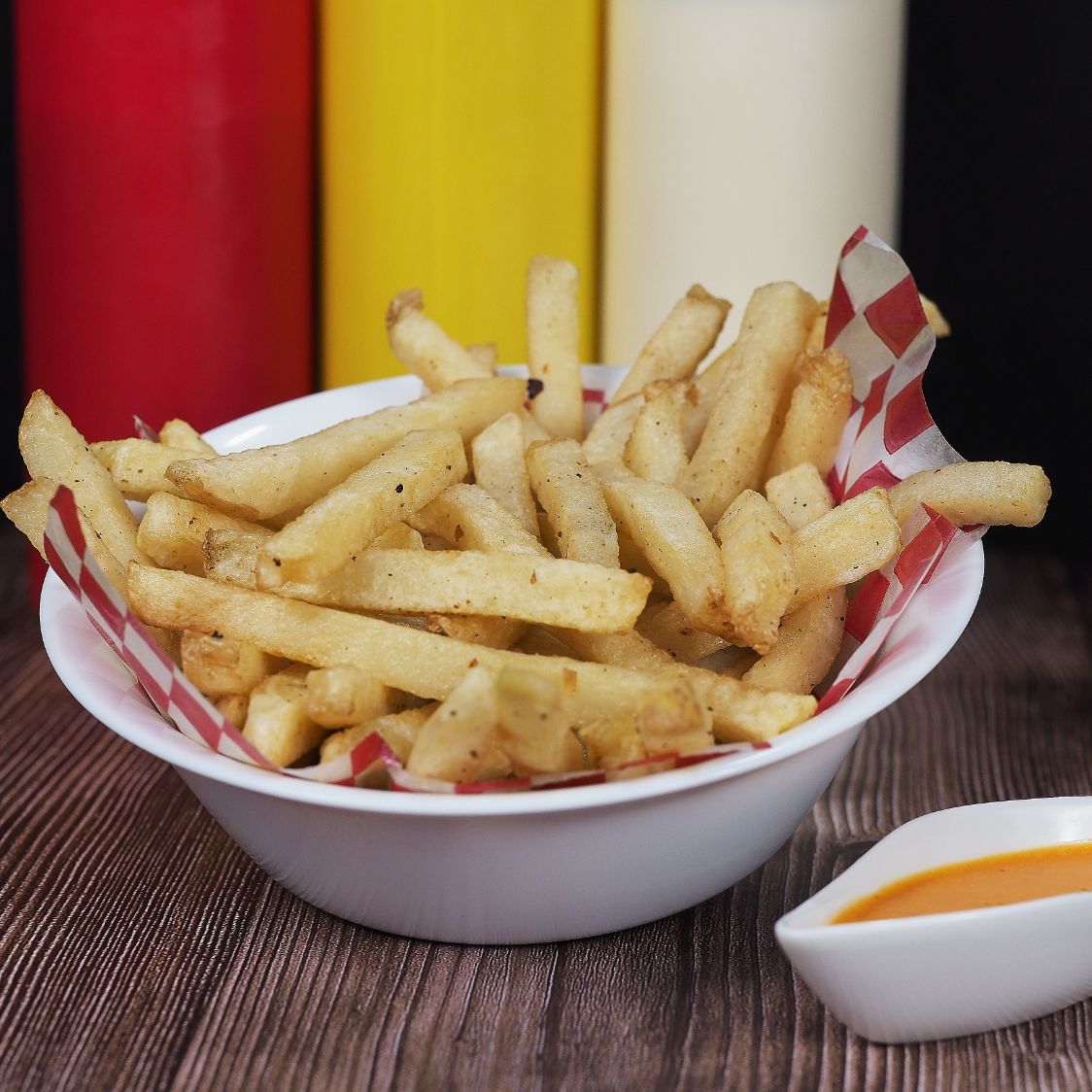 Papas en forma de baston freidas en aceite y sazonadas con sal. Esta orden se puede preparar con 4 aderezos y/o sazonadores. (Para 1 persona)