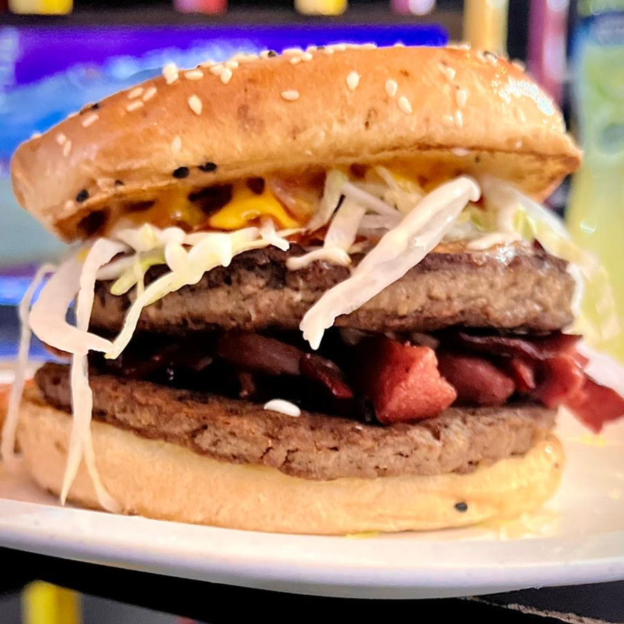 Hamburguesa Doble de Res con Lechuga, Jitomate, Cebolla, Catsup, Mostaza, Mayonesa, Q. Amarillo, Q. Mozarella, Tocino, Salchicha y chile toreado acompañada de papas