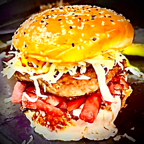 Hamburguesa de Sirloin Doble con Tocino, Salchicha, Q. Amarillo, Q. Mozarella, Lechuga, Jitomate, Catsup, Mayonesa, Mostaza y chile toreado, acompañada de papas.