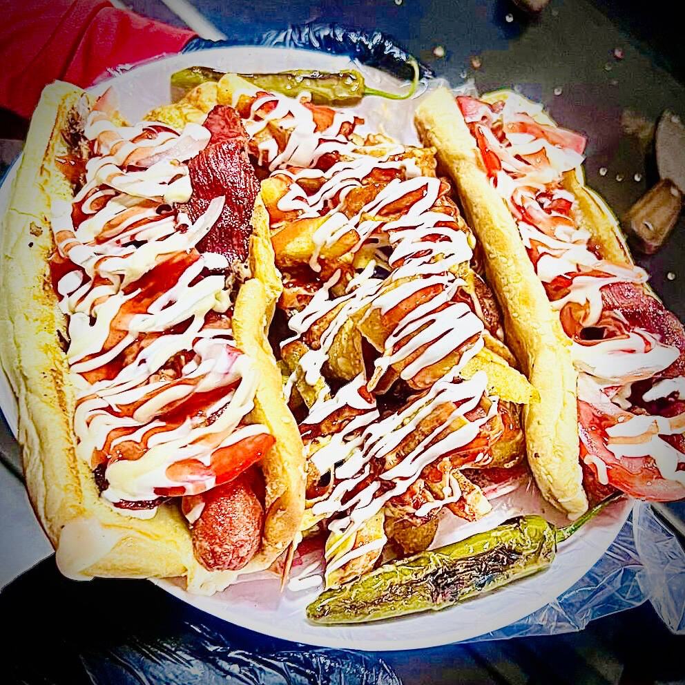Una y media salchicha de pavo, pan, jitomate, cebolla, catsup, mayonesa, mostaza, Q. Amarillo, Q. Mozarella, Tocino y chile toreado
