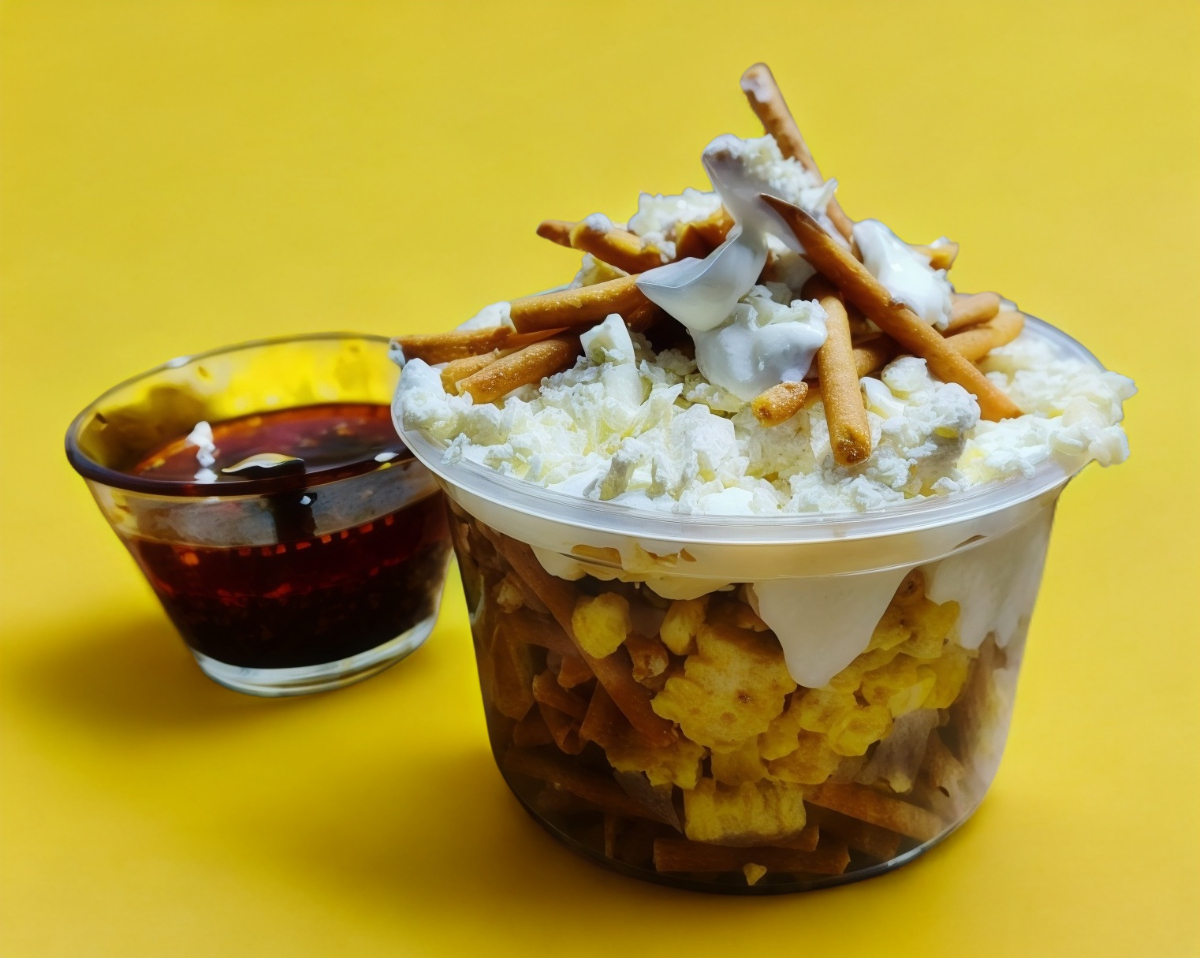 sazonada con variedad de salsas, salchicha, cacahuate y variedad de papas