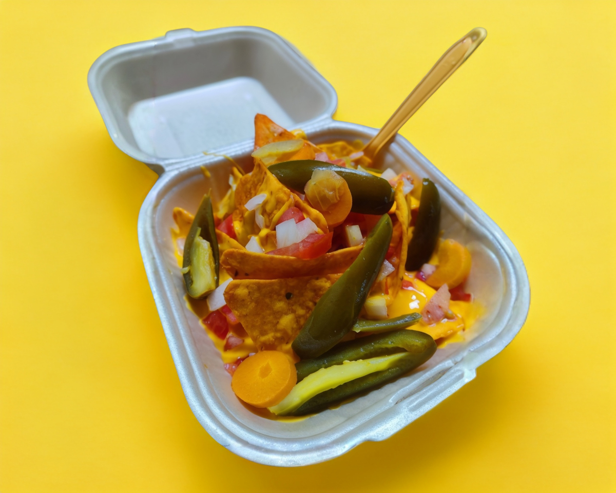 doritos, queso amarillo, jitomate, cebolla y chiles en vinagre