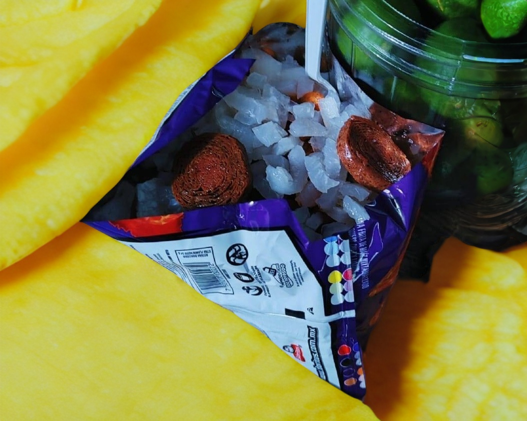 doritos, jicama, pepino, zanahoria, cacahuate, dulce de tamarindo y cueritos