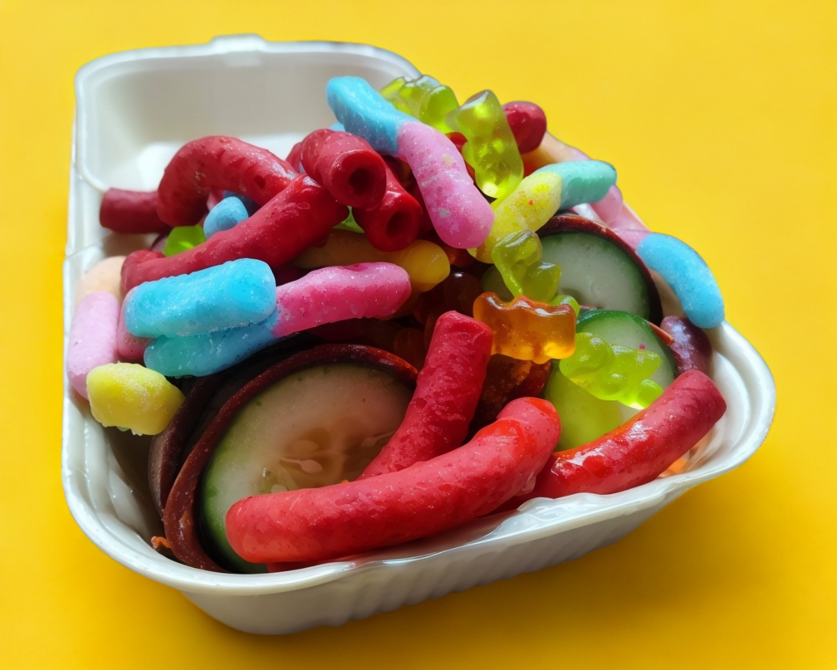 cubierto con pasta agridulce, acompañado con gomitas y takis fuego
