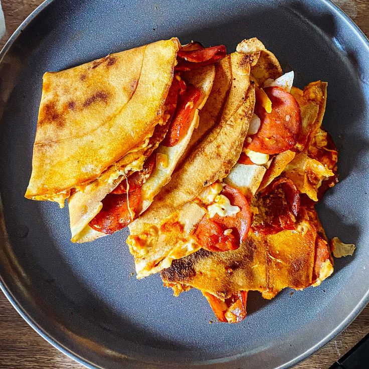 Tortilla de harina con salsa de tomate, queso y pepperoni