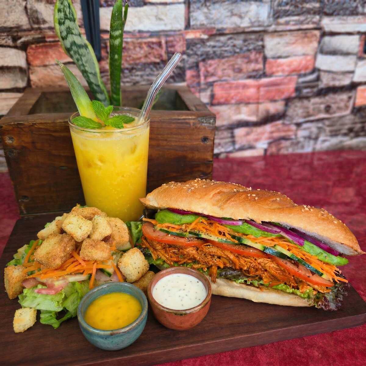 Sándwich de Pechuga de Pollo o Cerdo Adobado + Ensalada de Estación o Papas Chips + Bebida. Sabor artesanal, fresco y ultra completo.
