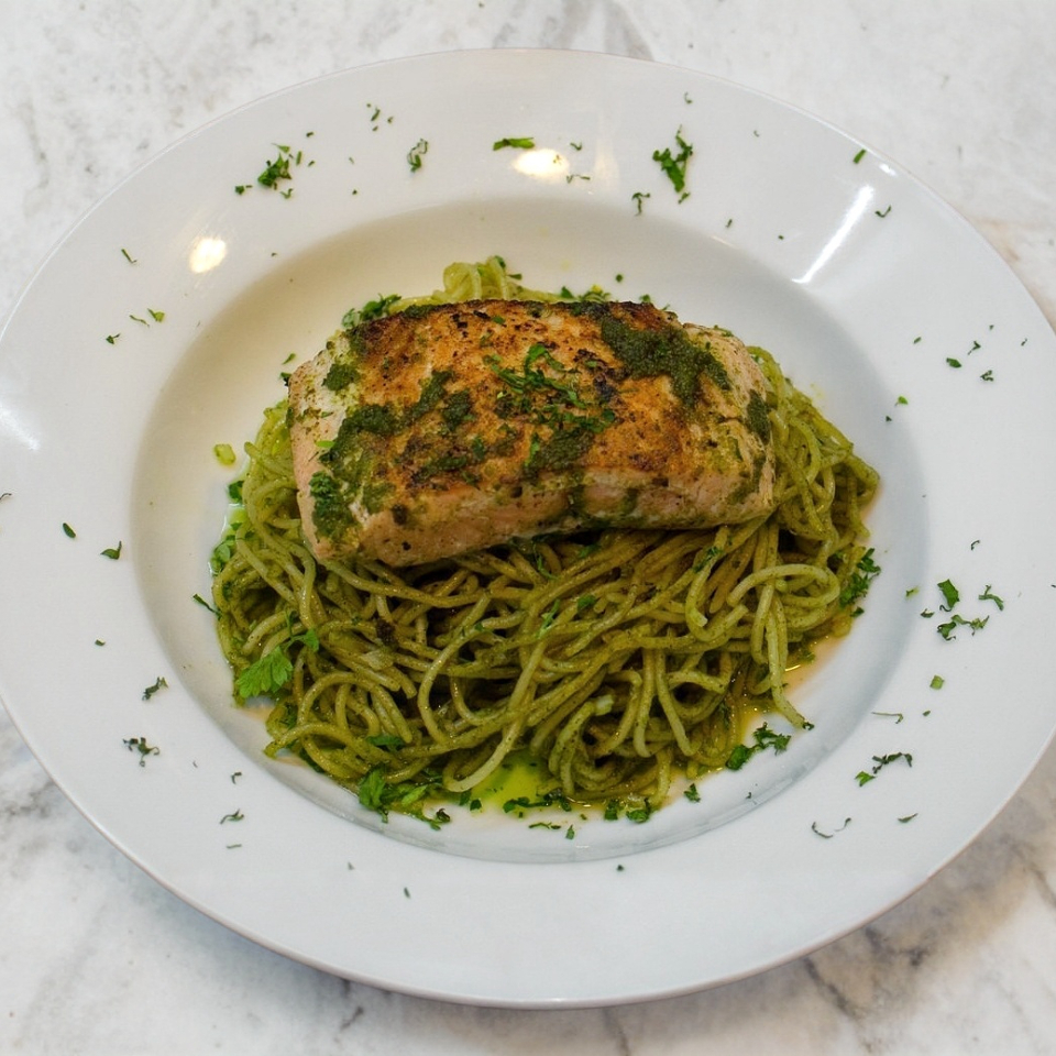 220 gramos, sellado a la parrilla, bañado delicioso pesto tradicional.