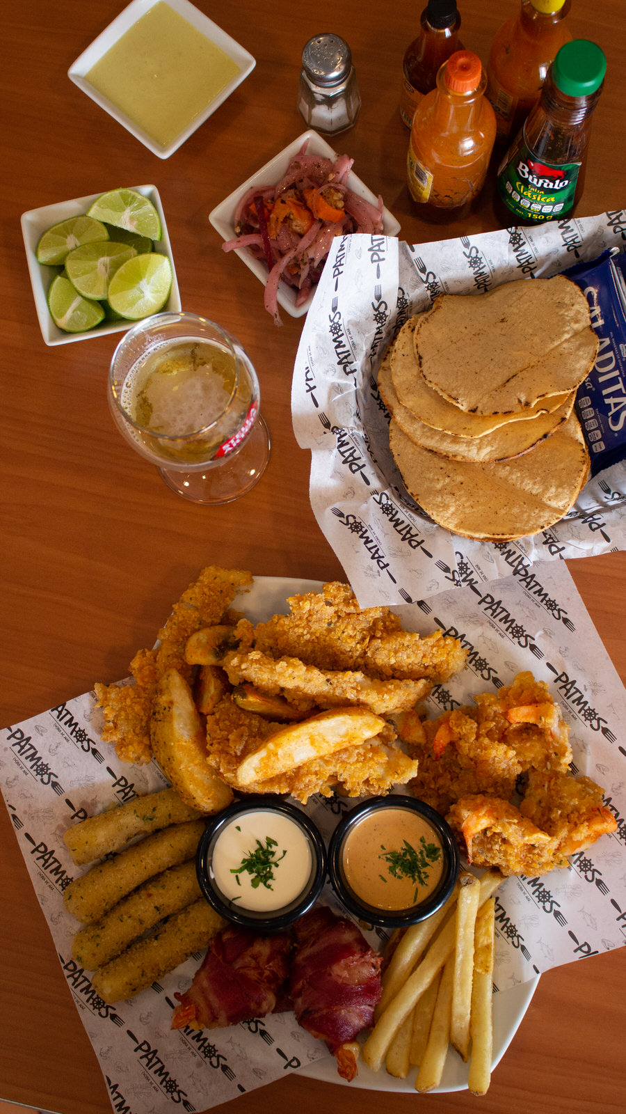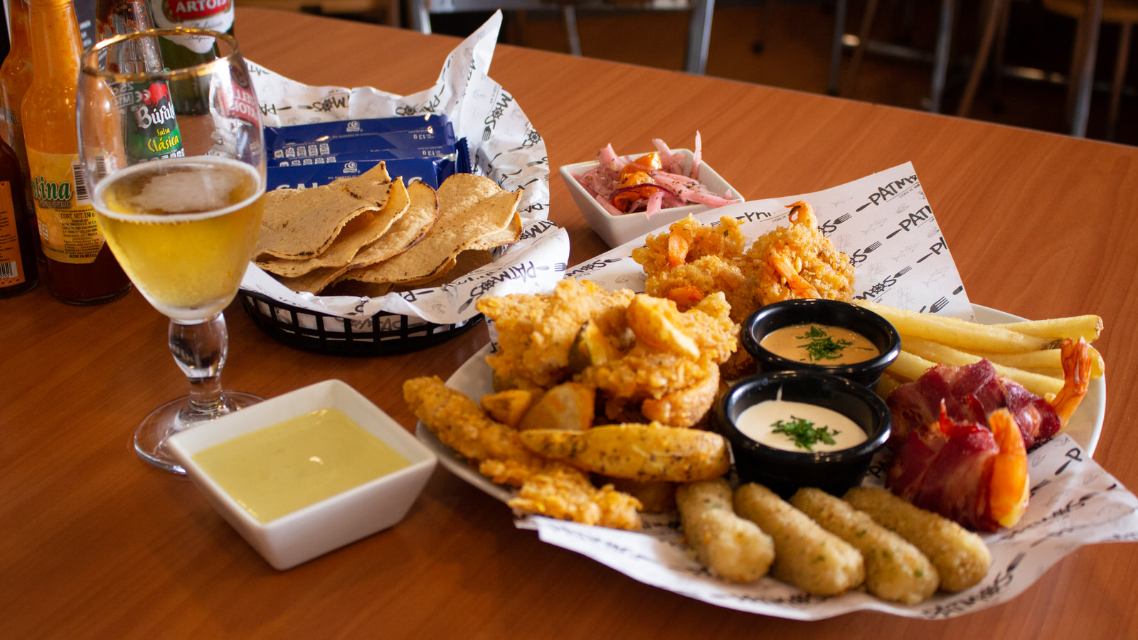 Deliciosa combinación de nuestros favoritos fish & chips, papas a la francesa, camarón beikon, camarón crunch, dedod de queso y dip de chipotle