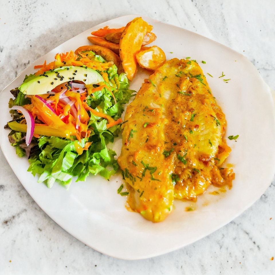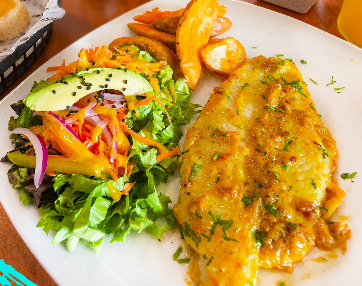 Filete de pescado, acompañados de ensalada de la casa y papas de gajo.