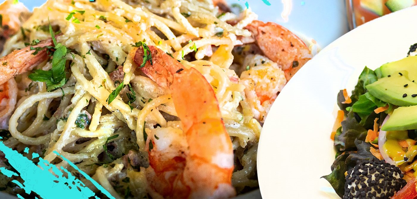 Pasta, salsa cremosa, tocino, camarones y un toque de perejil