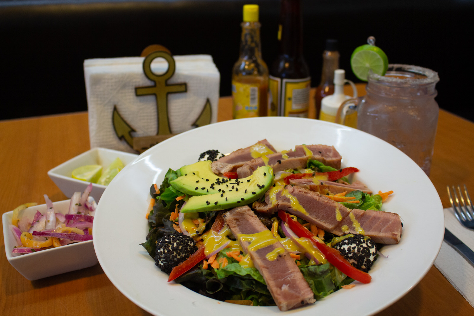 250 gramos, steak de atún marinado, sellado a la parrilla con costra de ajonjolí.