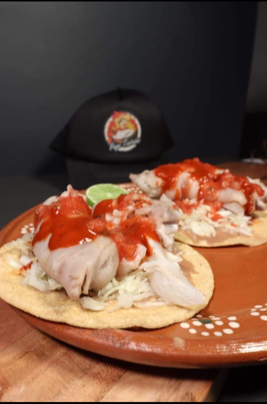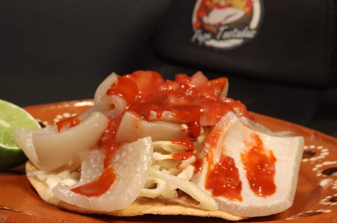 La tostada lleva frijoles, repollo, el ingrediente, salsa de jitomate y picante.