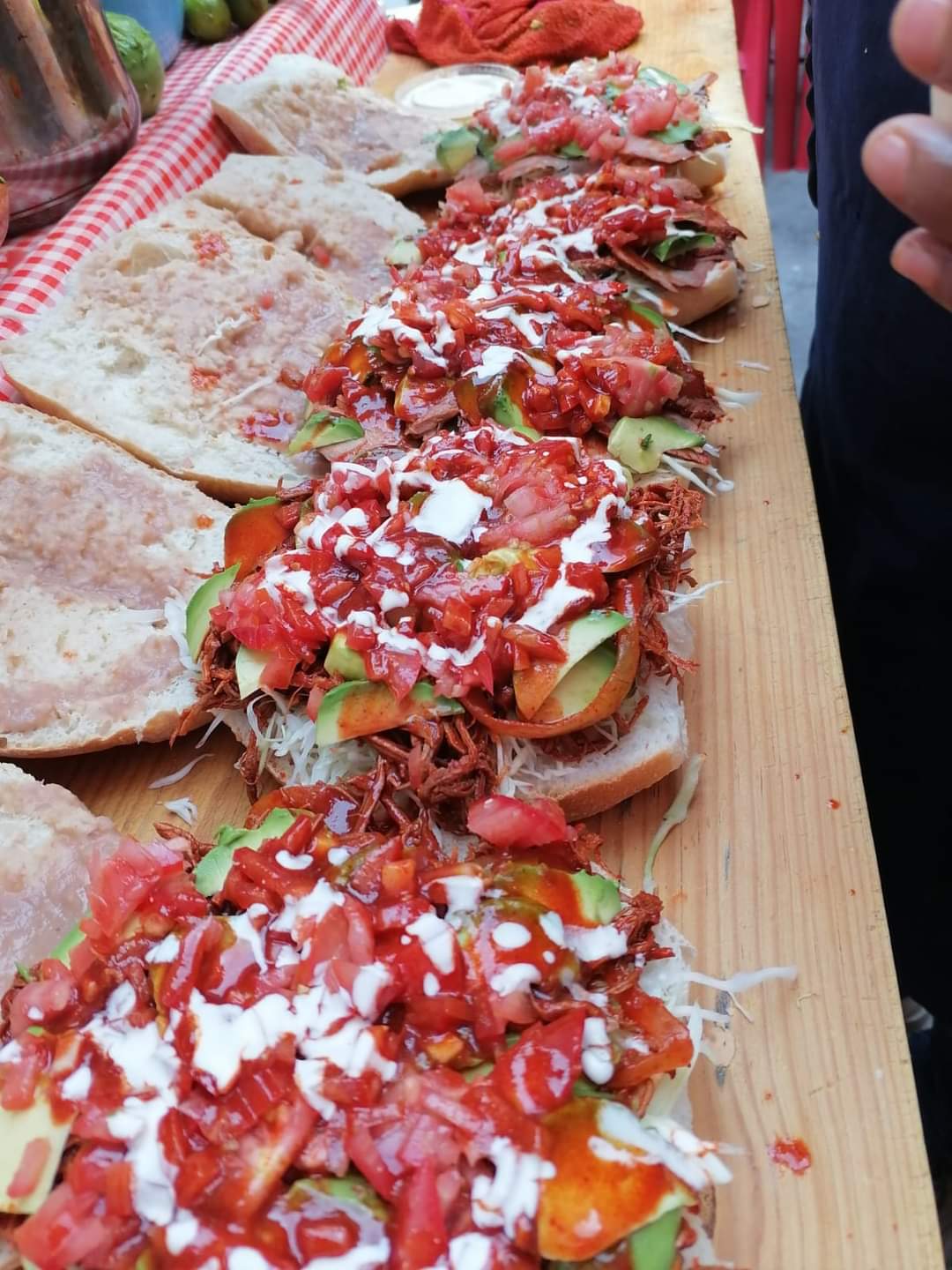 La torta lleva frijoles repollo ,lomo,deshebrada, adobera jitomate adobo chile verde, crema, y aguacate.