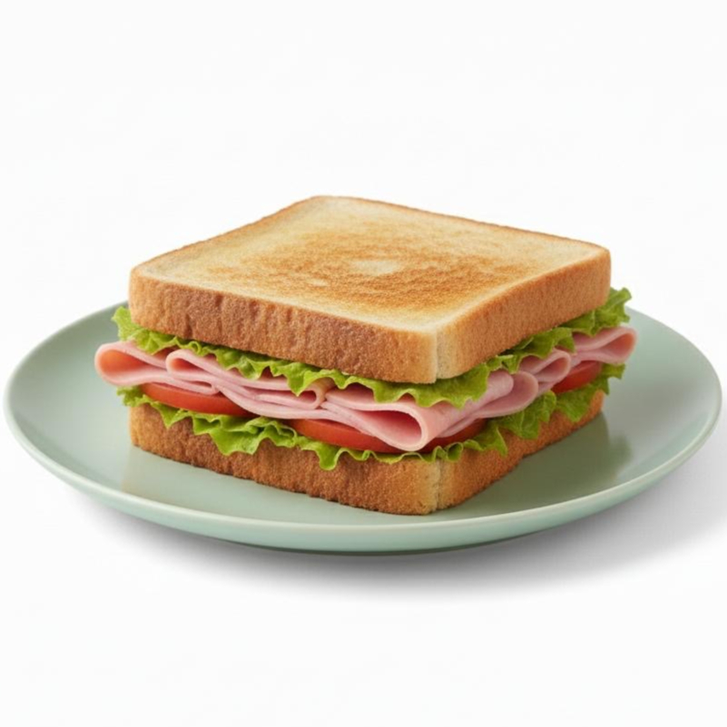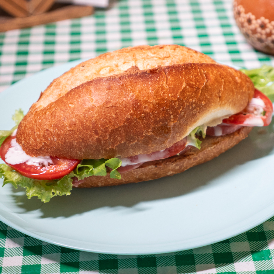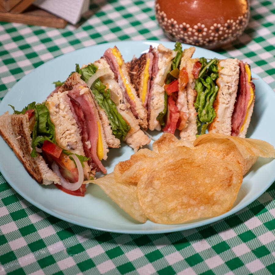 3 piezas de pan rellenas de jamón, pollo, tocino, queso amarillo, queso asadero, lechuga, jitomate, cebolla y chile, acompañado de papas fritas.