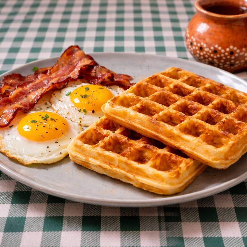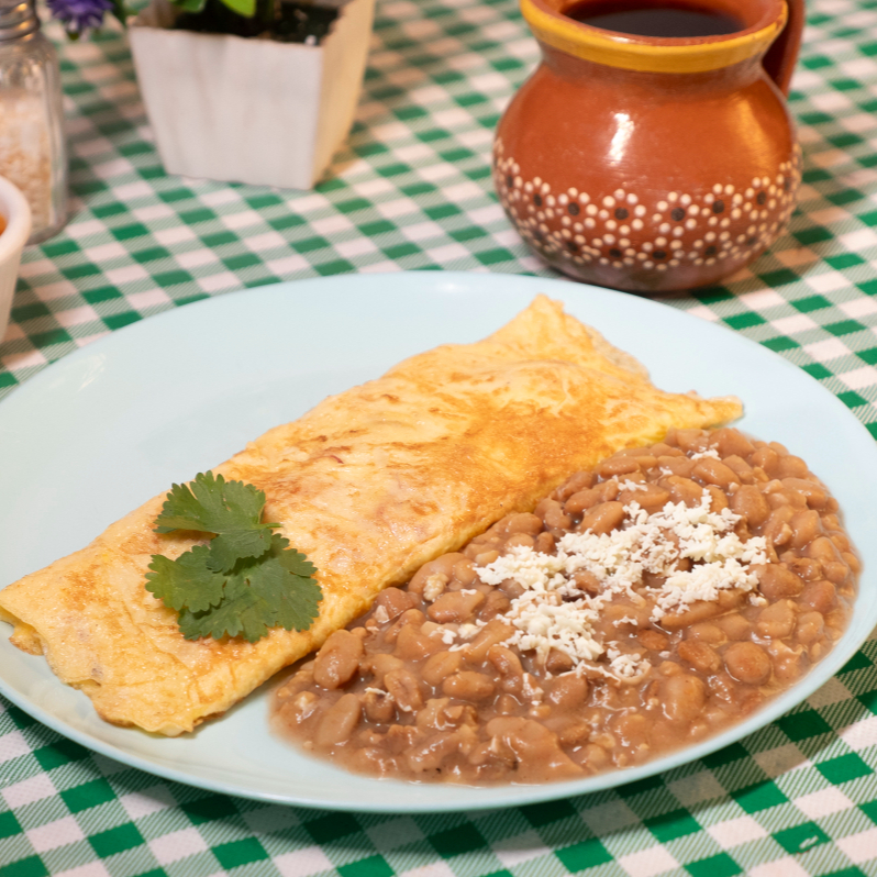 Tortilla de huevo rellena de queso con ingredientes a elegir: Chorizo, jamón, tocino, salchicha, pollo. Acompañada de frijoles, tortillas y salsa.