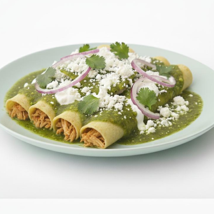 Bañadas en una deliciosa salsa verde, rellenas de pollo, cubiertas con queso gratinado y crema.