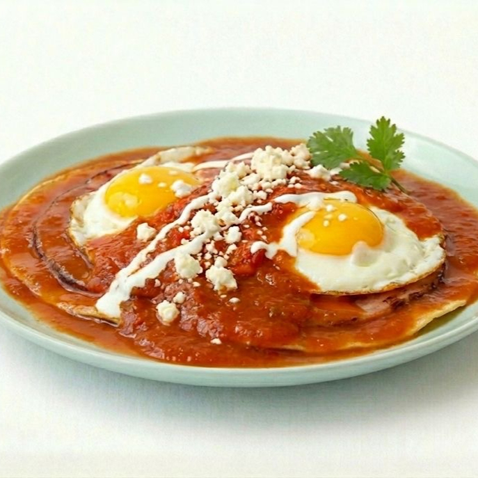 Huevos estrellados sobre dos tortillas fritas con jamón, bañadas en salsa roja con crema y queso ranchero.