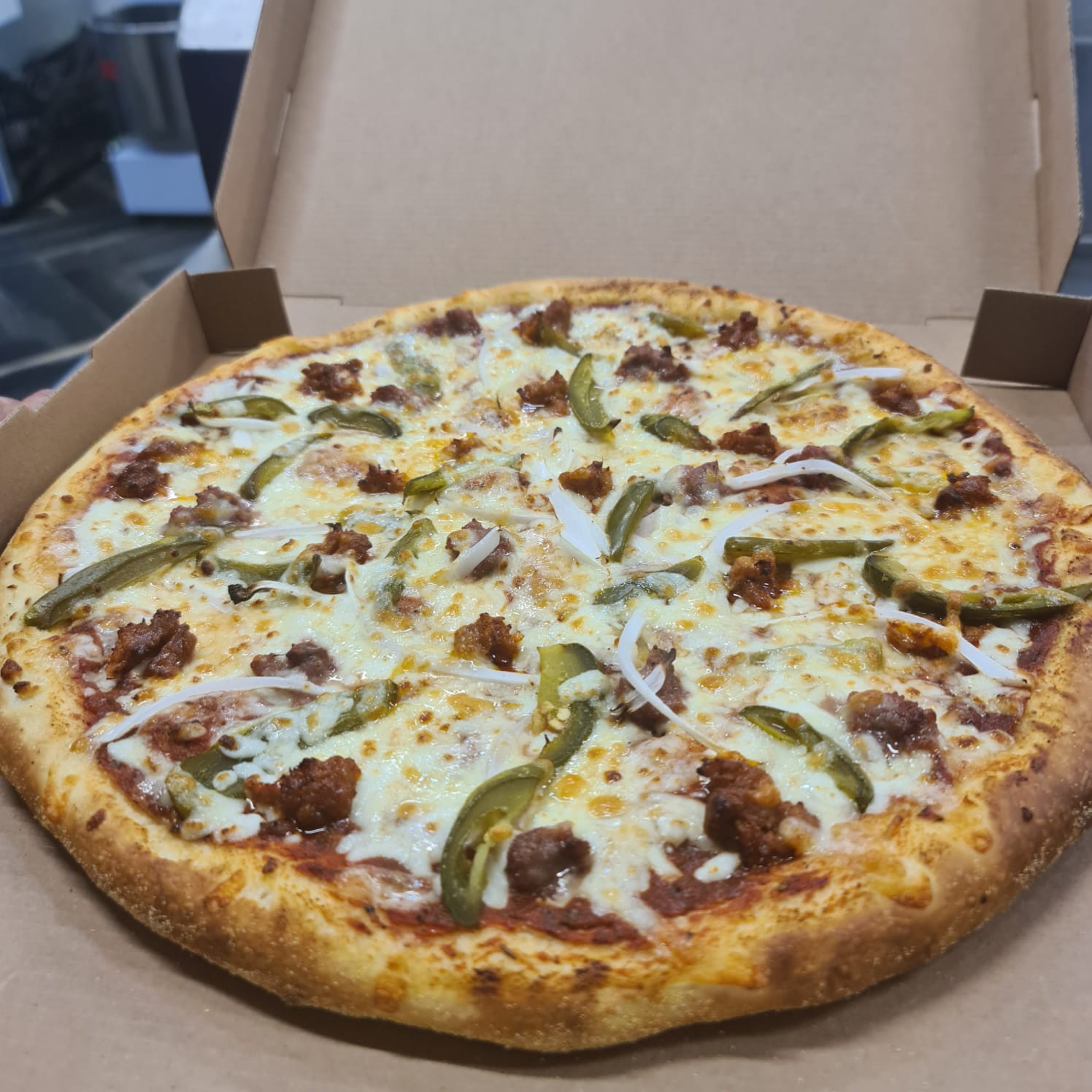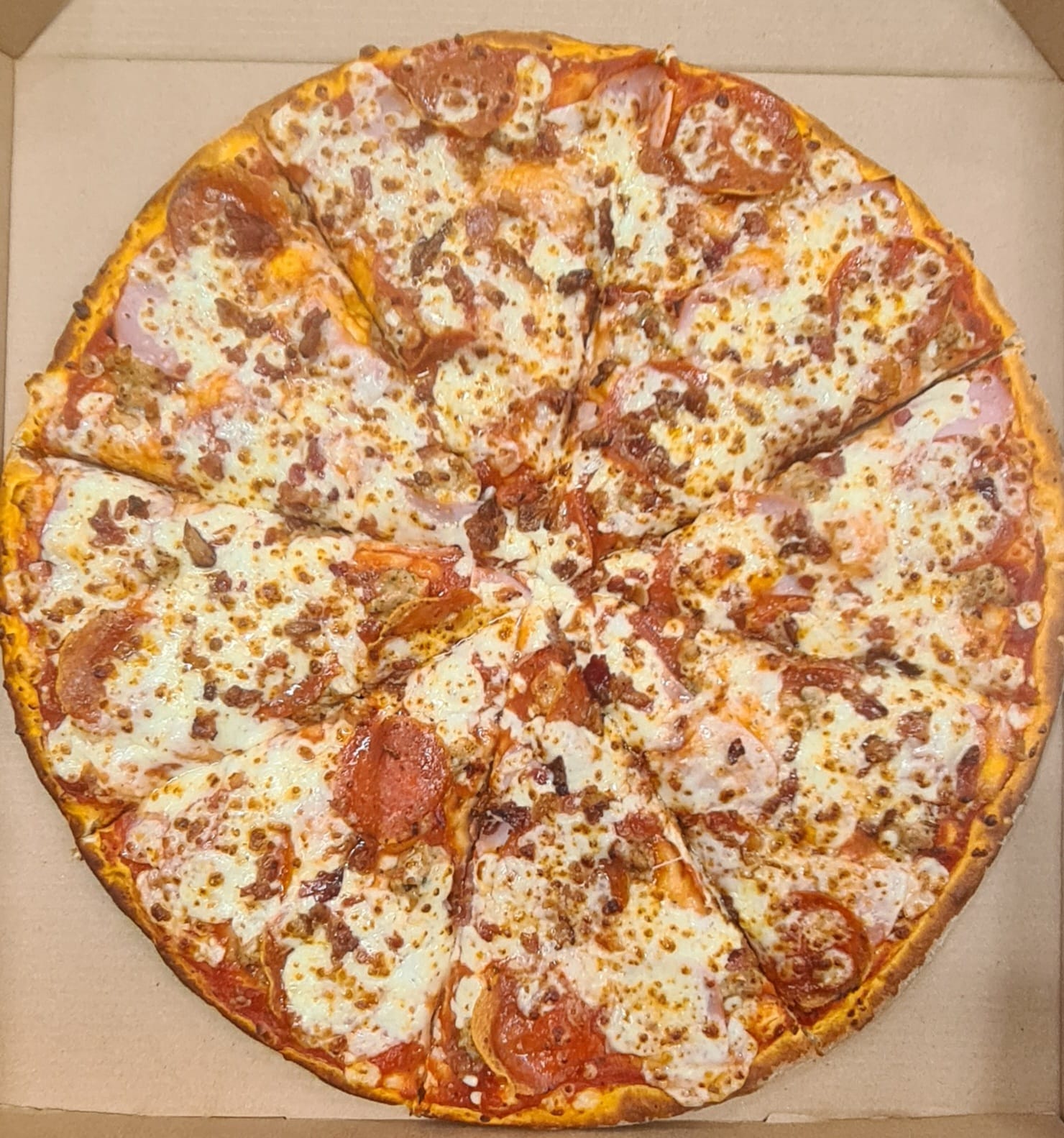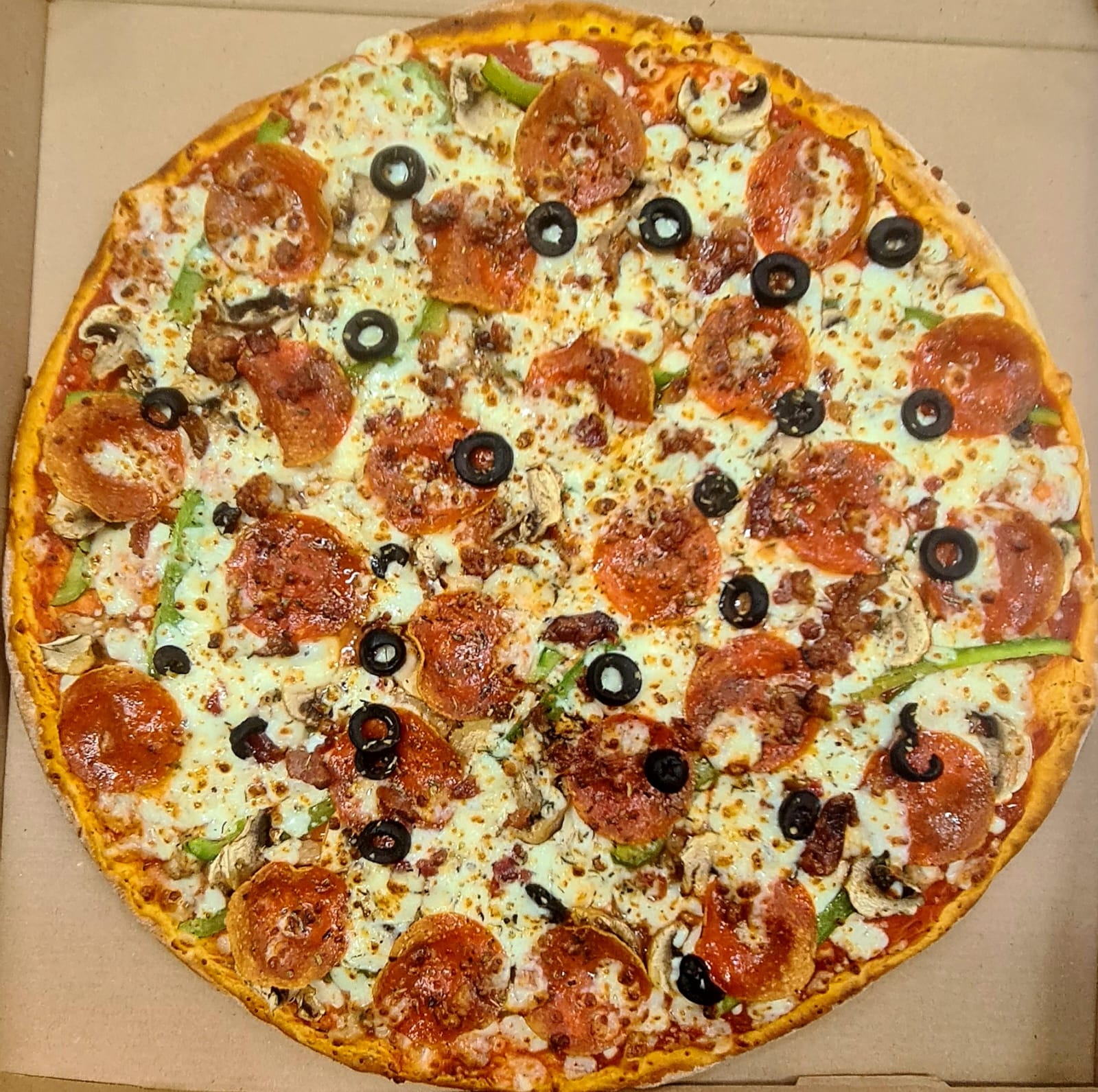 Salchicha italiana, pepperoni, champiñón, tocino, pimiento morrón y aceituna negra.