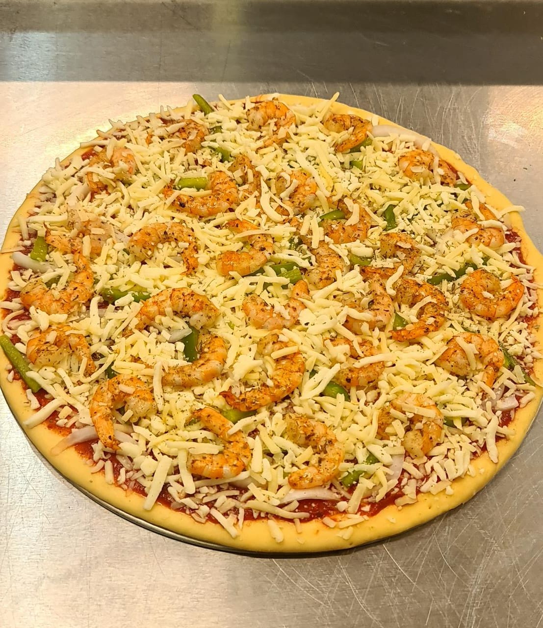 Pizza de 16 pulgadas de camarón, pimiento y cebolla.