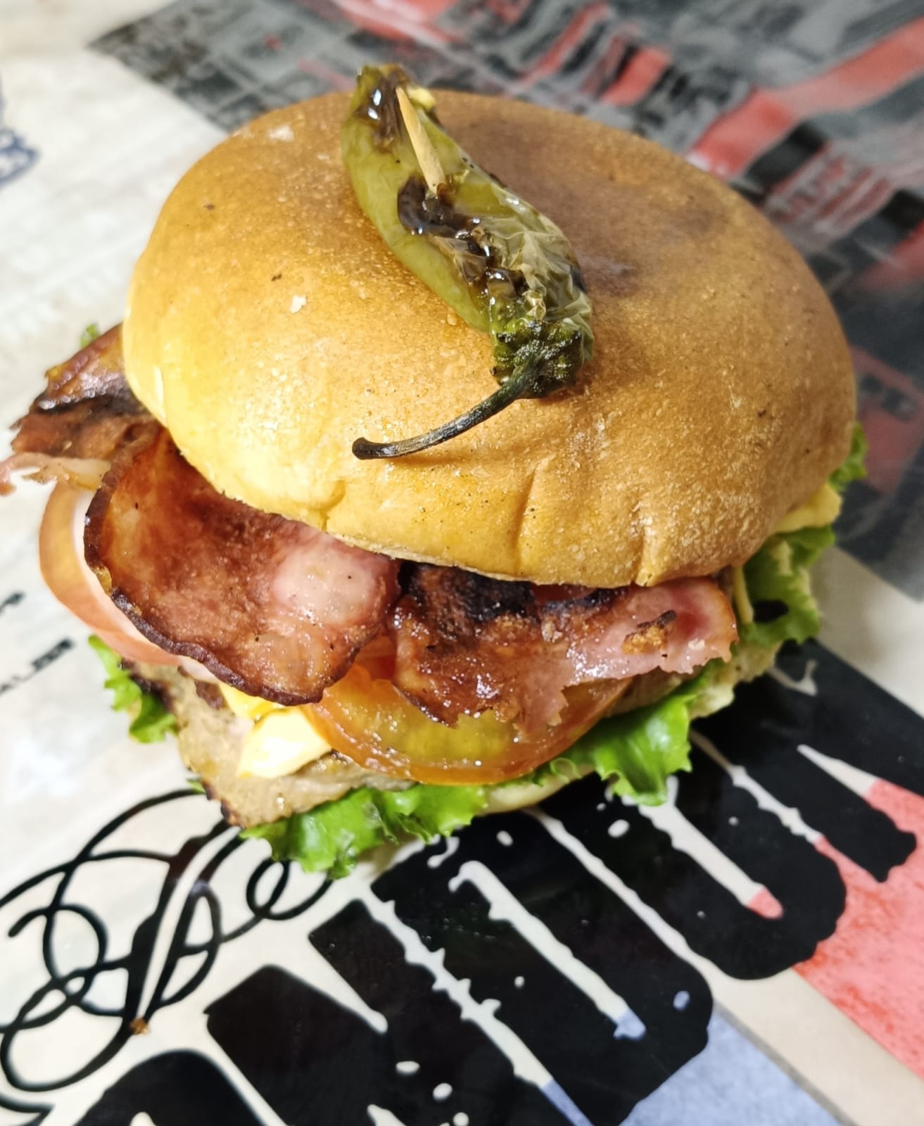 Carne, queso manchego derretido, tocino crujiente que se siente en cada bocado, simple, directa y perfecta. Incluye porción de papas