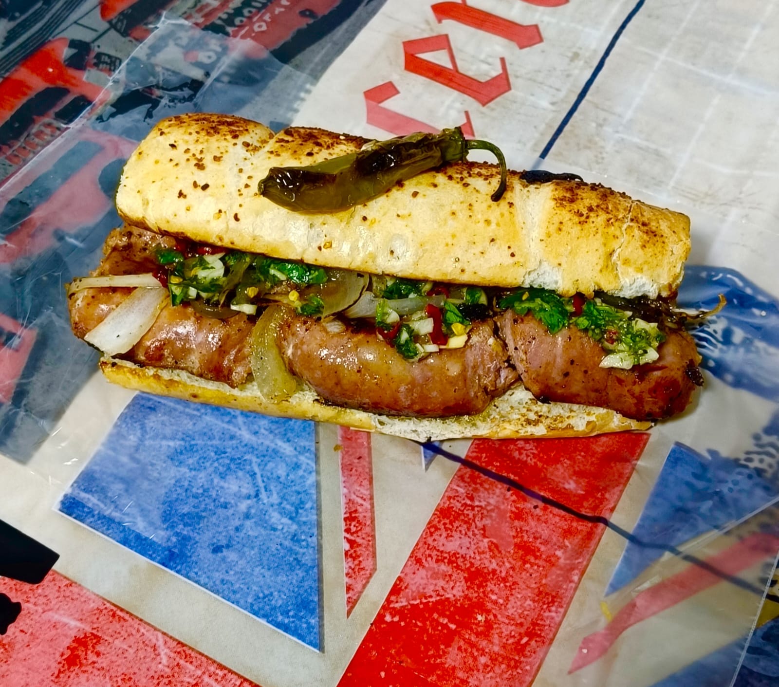 Pan estilo baguette, chorizo argentino parrillero, chimichurri de la casa.