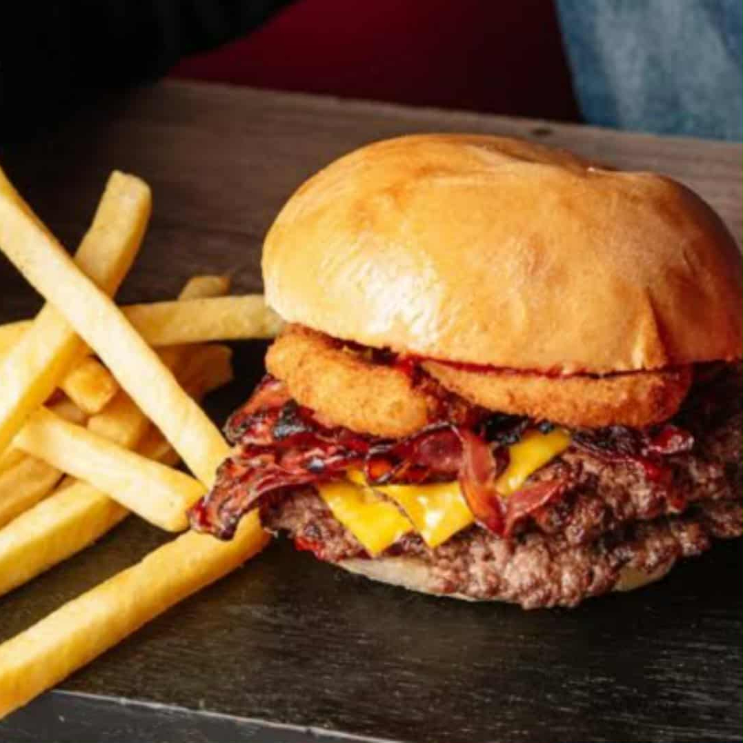 Carne jugosa, queso manchego derretido, tocino crujiente y aros de cebolla dorados. Crunchy y jugosa Incluye porción de papas