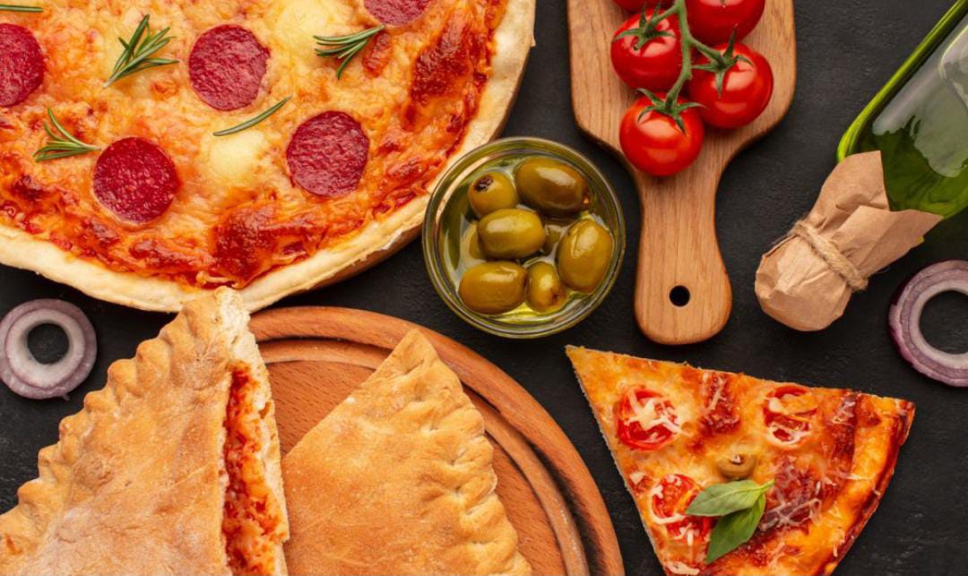 Una pizza mas seis rollos rellenos de pepperoni, salsa pomodoro y queso.
