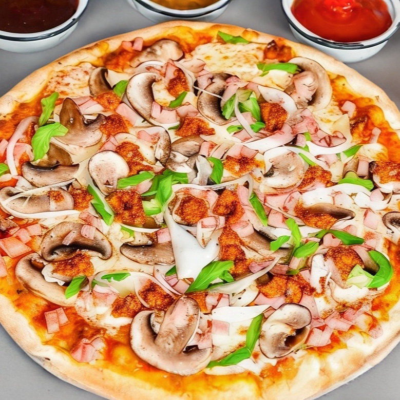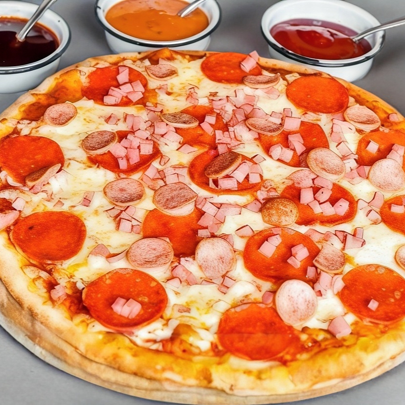 Salami, salchicha, champiñones, pimiento, queso mozzarella. Contiene 8 rebanadas