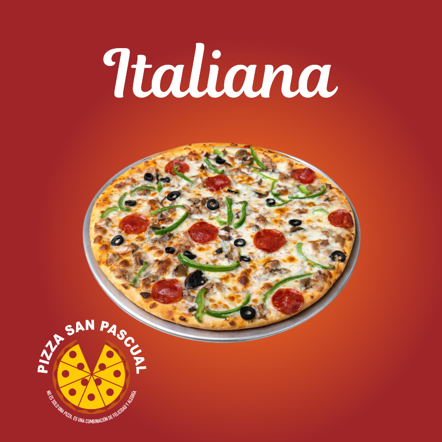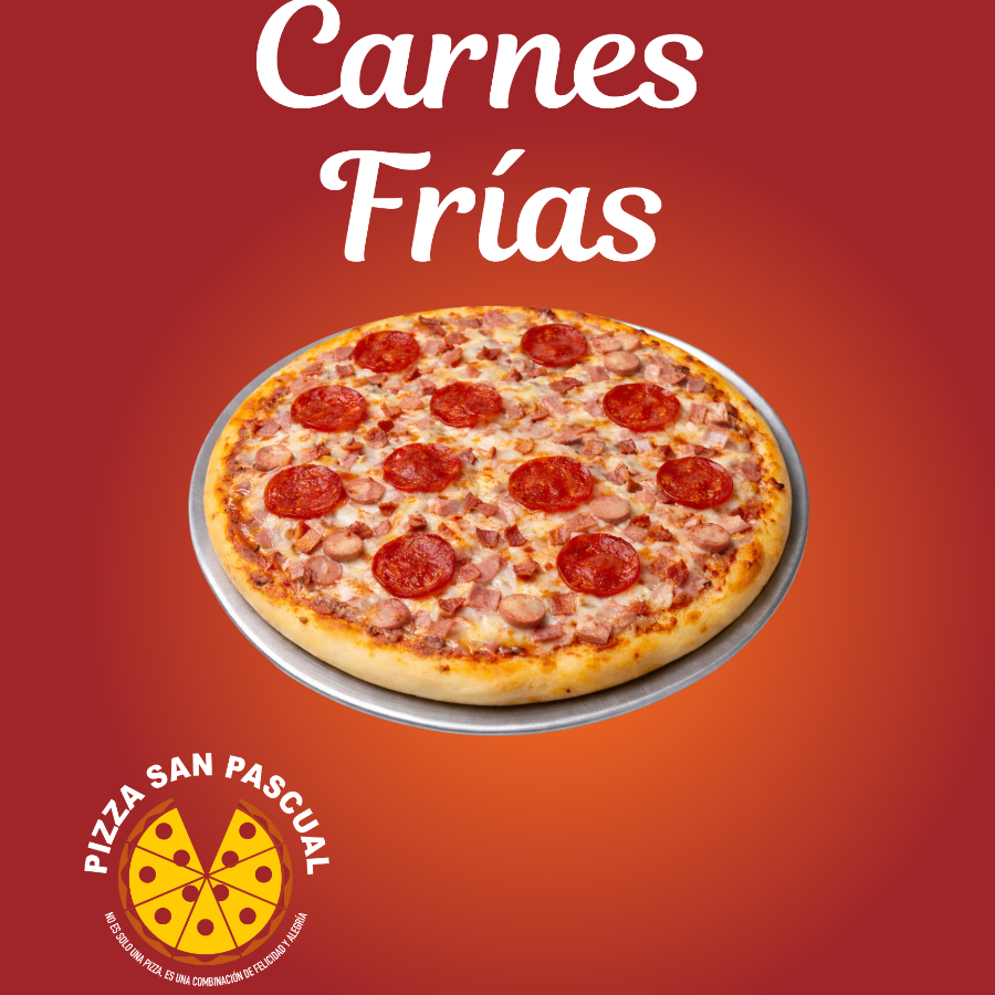 Jamón, Salchicha, pepperoni, tocino, queso mozzarella y salsa de tomate.