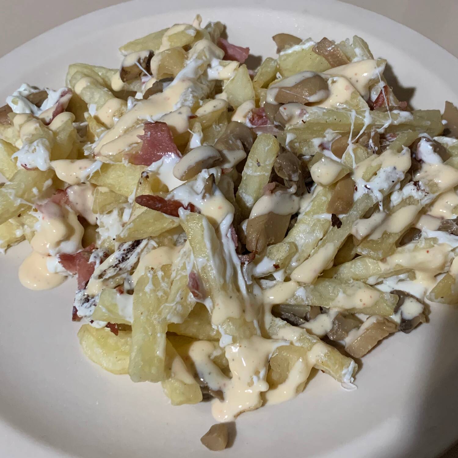 Papas a la francesa con champiñones, tocino y piña gratinadas con queso oaxaca.