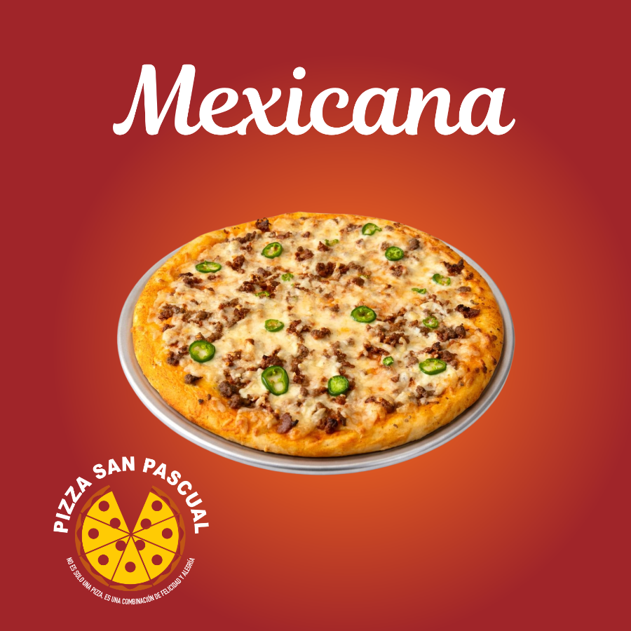 Chorizo, carne molida, chile Serrano, jalapeño, Mozzarella y puré de tomate.