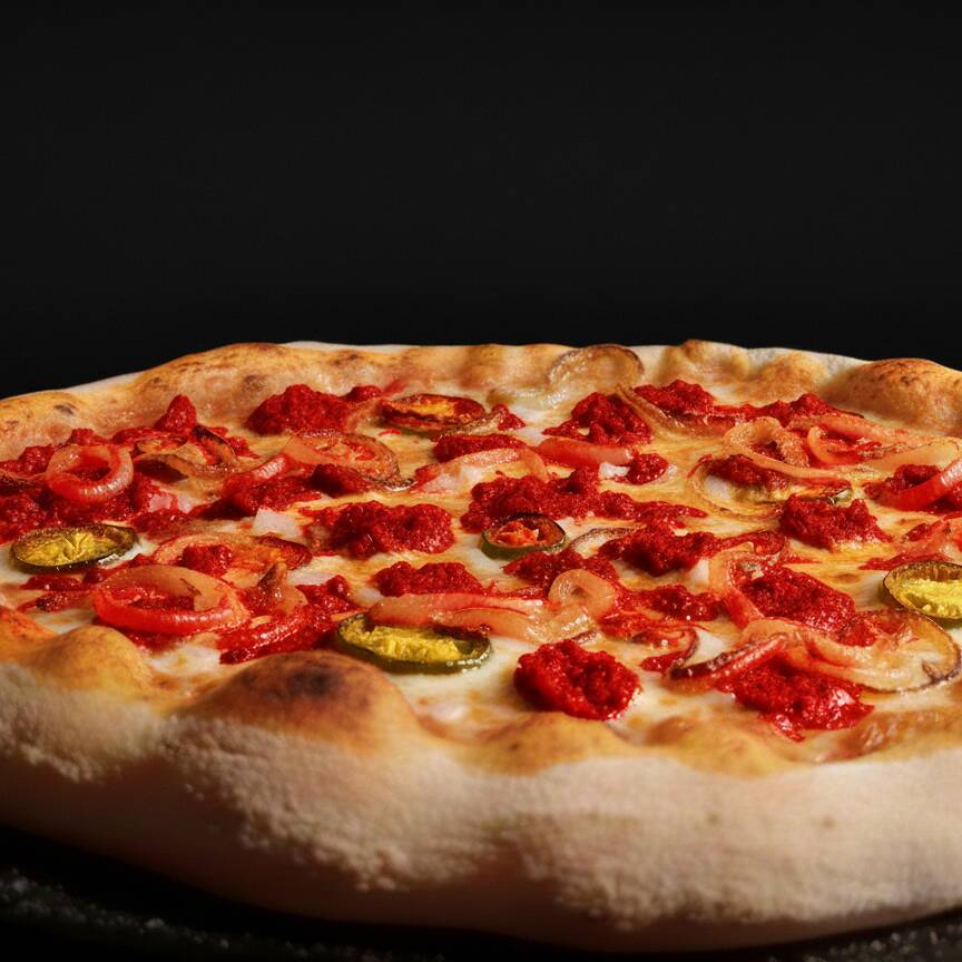 Pizza familiar tipo napolitana con una base de frijoles fritos, cebolla, jalapeño y quesos