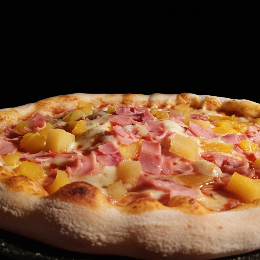 pizza familiar tipo napolitana con quesos, piña dulce casera, salsa especial y jamon