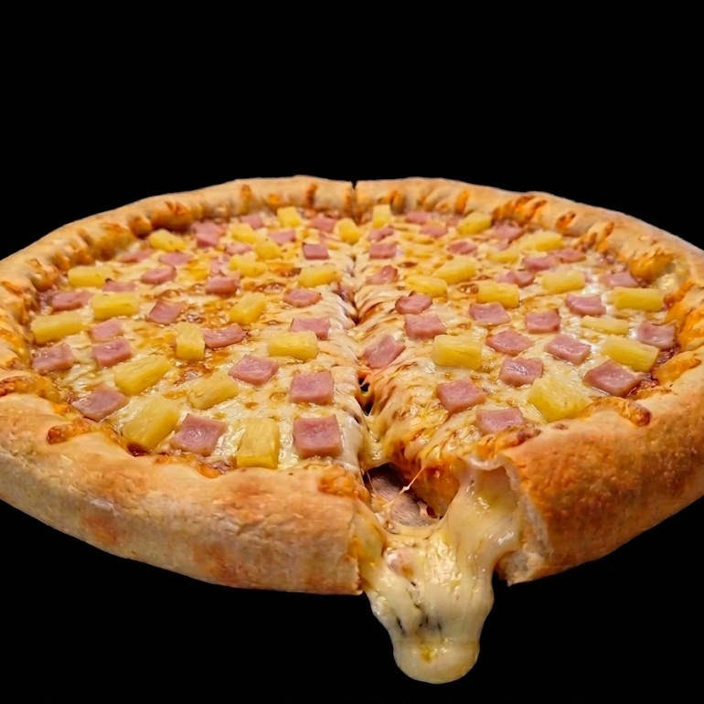 Pizza mediana tipo napolitana con quesos, piña dulce casera, jamón