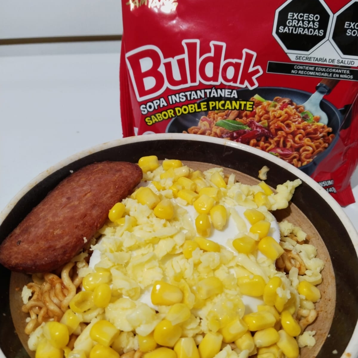 Ramen instantáneo Buldak con mezcla de queso, elote amarillo y tocino