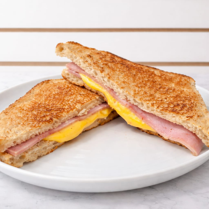 Emparedado de mezcla de quesos y jamon acompañado de papas picosas fritas