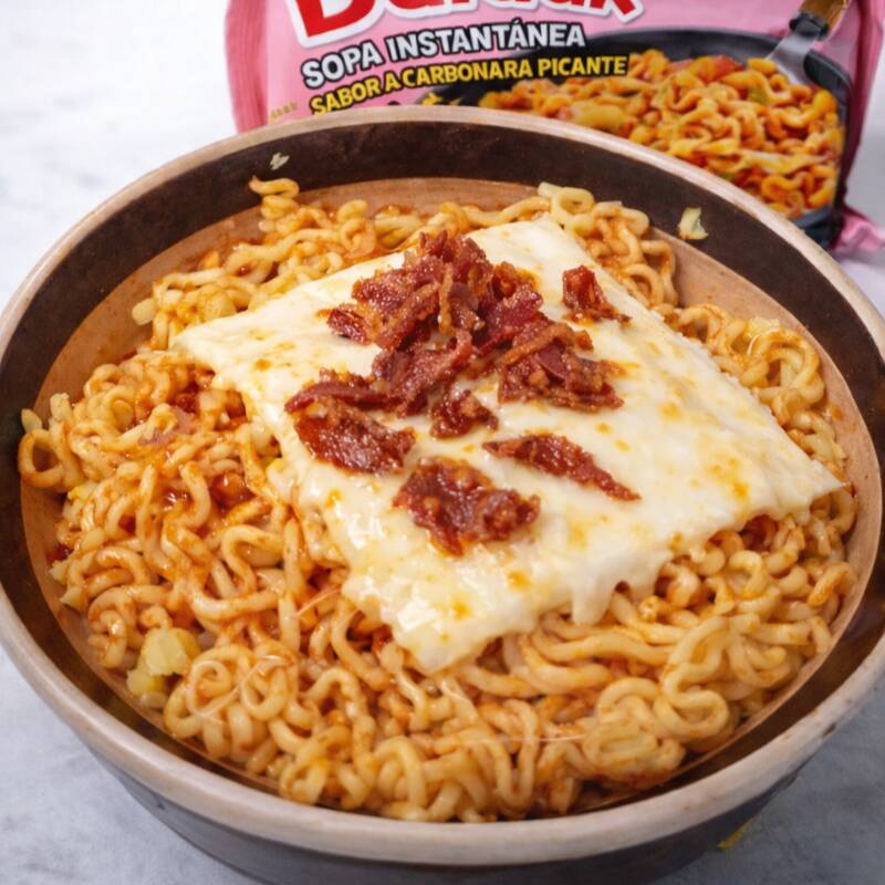 Ramen instantáneo Buldak con queso machego,tocino y champiñonrs