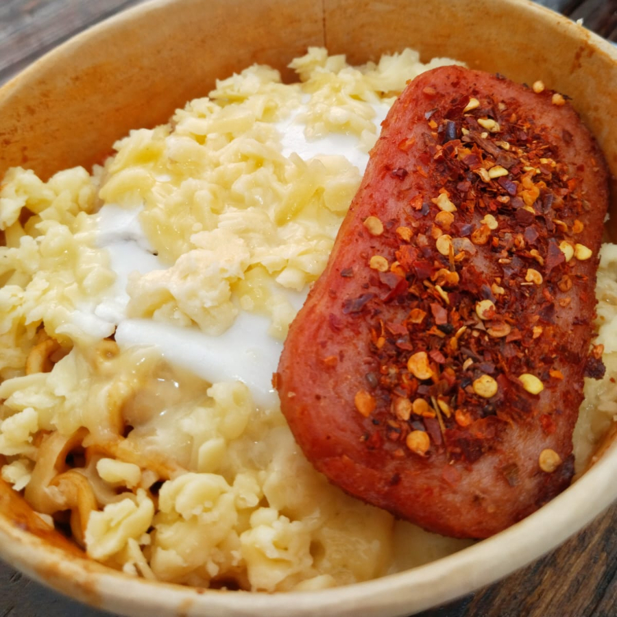 Ramen instantáneo Buldak con spam enchilado, mezcla de quesos y ajonjolí