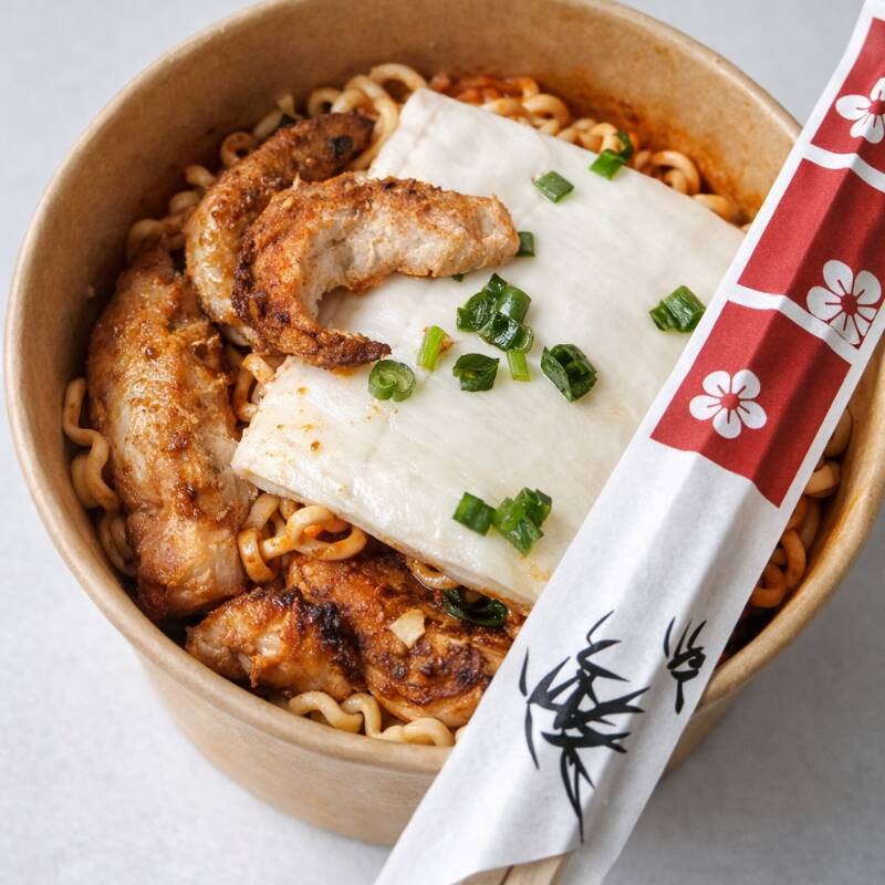Ramen instantáneo Buldak con pollo, queso manchego y cebollin