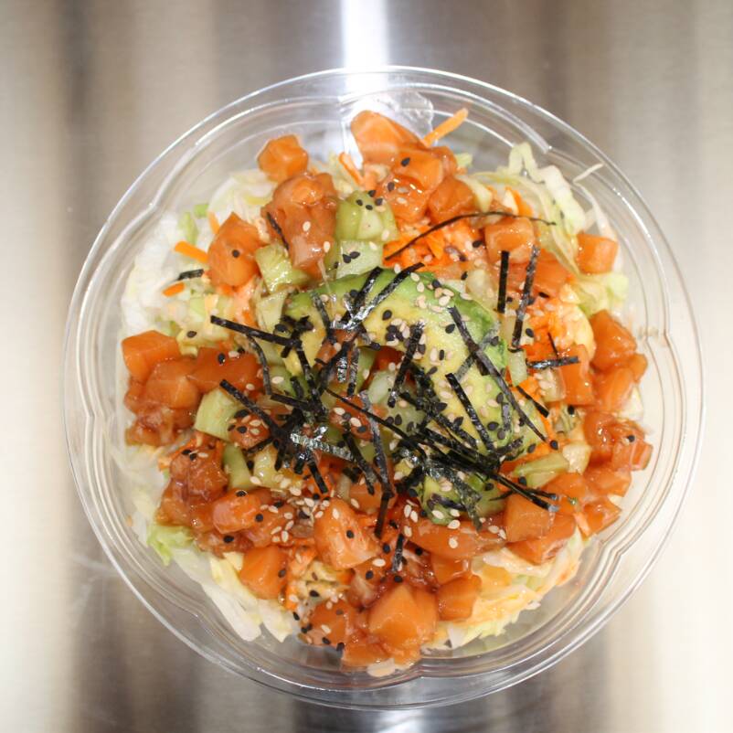 Bowl con una base de arroz blanco, acompañado de Ajonjoli, cebolla deshidratada, salsa teriyaki, lechuga, zanahoria, pepino y aguacate. 60 gramos aproximadamente de Salmon crudo mezclado con salsa soya y salsa teriyaki, salsa mayonesa spicy o no spicy y algas nori. Todos nuestros bowls tienen la misma base de arroz blanco, sésamo, salsa teriyaki, lechuga, pepino y zanahoria.